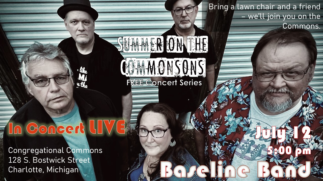 Baseline Band, Summer on the Commons Concert Series Come out to enjoy Classic Rock! Date Jul 12 2025 Expired! Time 5:00 pm - 8:00 pm Location Congregational Commons (Commons) 126 S Bostwick St, Charlotte MI 48813 Category Front Page Organizer Jan Shall Phone 2698325114 Email Janshall00@gmail.com Other Organizers Curt Scott Phone (517)402-3896 Email curtisjscott@hotmail.com Adam Droscha Email adam.droscha@gmail.com Share this event