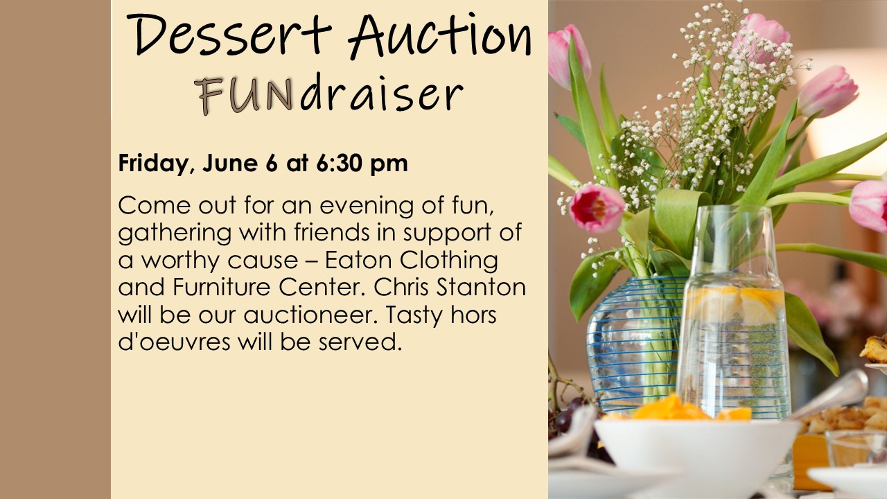 Dessert Auction Fundraiser for Eaton Clothing/Furniture Center Date Jun 06 2025 Expired! Time 6:30 pm - 8:30 pm Location Bess Fulton Room (BFR) 106 S Bostwick St, Charlotte MI 48813 Category Front Page Organizer Amy Frost Email frosta@pennfield.net Share this event
